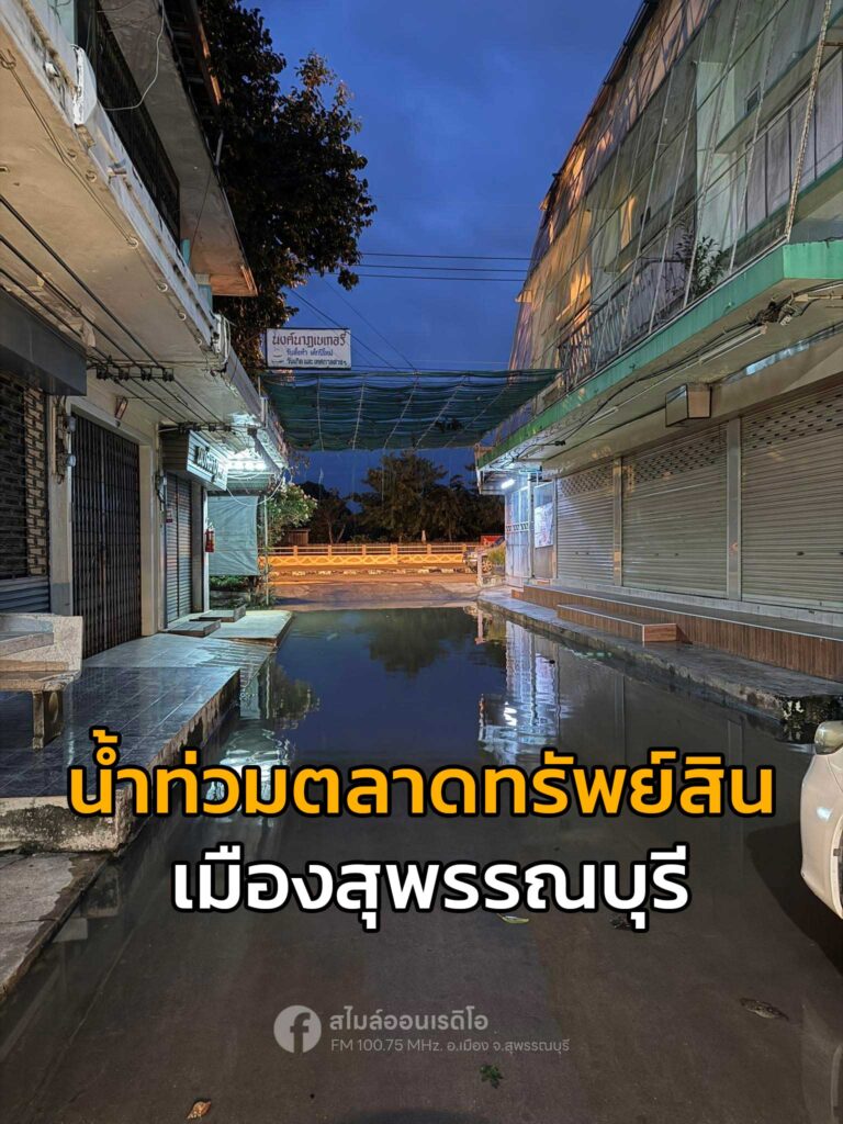 วันที่ 5 พฤศจิกายน 2568 — พื้นที่เขตเทศบาลเมืองสุพรรณบุรี โดยเฉพาะบริเวณตลาดทัพย์สิน พบระดับน้ำเพิ่มขึ้นอย่างรวดเร็ว หลังจากมีฝนตกหนักหลายชั่วโมงและรับน้ำจากแม่น้ำ ท่าจีน ที่มีระดับเหนือเกณฑ์ปกติ ส่งผลให้น้ำเอ่อเข้าท่วมถนนทางเข้าตลาดและบริเวณชั้นล่างของร้านค้า พ่อค้าแม่ค้าเร่งย้ายสินค้าขึ้นที่สูง เพื่อลดความเสียหาย